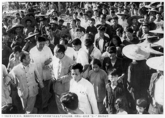1951年至1966年,陶铸主政广东15年。图为1958年4月30日,陶铸等陪同毛泽东视察广州市棠下农业生产合作社。