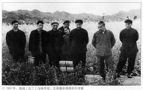1961年11月,陶铸(右二)与张平化、王延春在湖南农村考察。