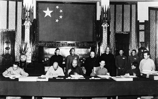 图为1951年5月23日,原西藏地方政府全权代表阿沛•阿旺晋美等与中央人民政府全权代表李维汉、张经武、张国华、孙志远在北京签订《关于和平解放西藏办法的协议》。