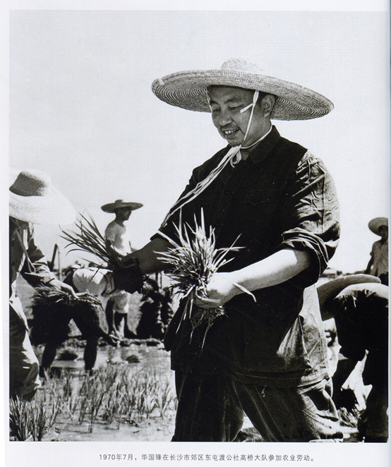 华国锋以身作则,与干部群众同甘共苦、艰苦创业。图为1970年7月29日,华国锋在长沙市郊区东屯渡公社高桥大队插秧。