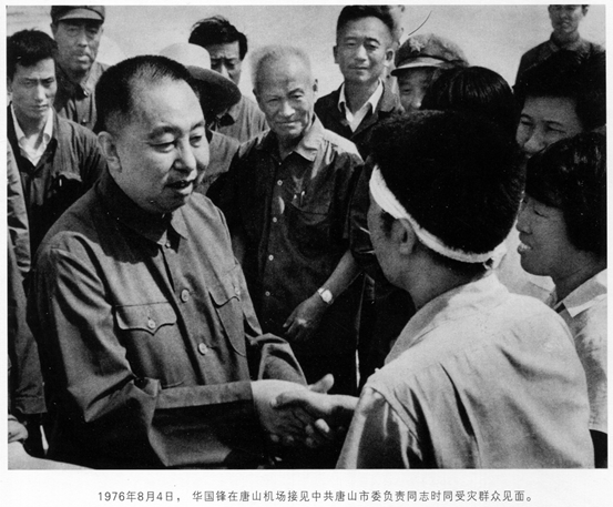 唐山大地震发生后,华国锋多次视察地震灾区。图为1976年8月4日在唐山机场接见唐山市负责同志时同受灾群众见面。