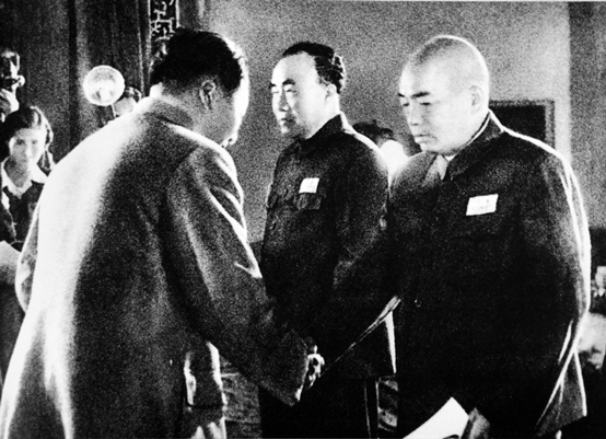 彭德怀长期担任军队的高级领导职务,在国内外享有崇高的声望。图为1955年9月毛泽东授予彭德怀元帅衔。