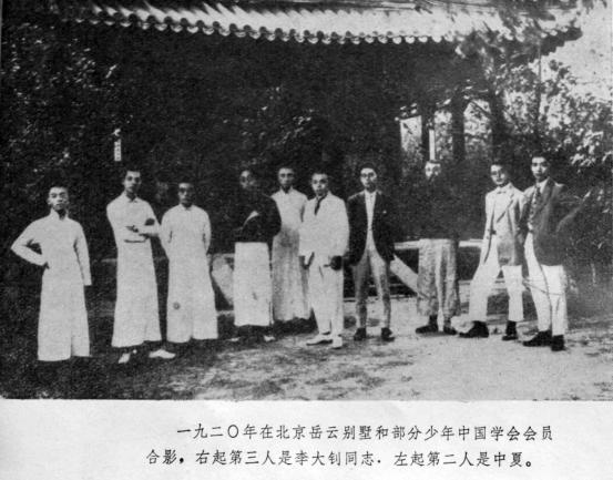 1920年在北京岳云别野和部分少年中国学会会员合影,右起第三人市李大钊同志,左起第二人是邓中夏。
